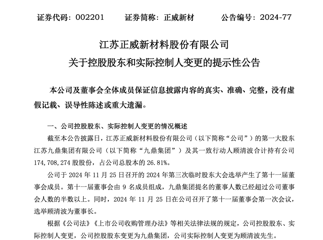 2024年11月25日,正威新材公告称,公司选举产生了第十一届董事会成员,由9名成员组成,其中九鼎集团提名的董事人数已超公司董事会人数的半数以上。同日,正威新材还选举顾清波为董事长,董秘也更换为九鼎集团副董事长的缪振。