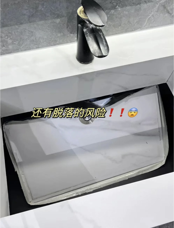 然而,随着时间的推移,我逐渐发现,所谓的“岩板一体盆”并非真正意义上的一体成型,而是通过胶水粘贴组装而成。最终呈现的成品,与我的预期相去甚远。拼接处的胶痕清晰可见,甚至安装师傅都着重提醒,这种粘贴工艺存在台盆掉落的风险。