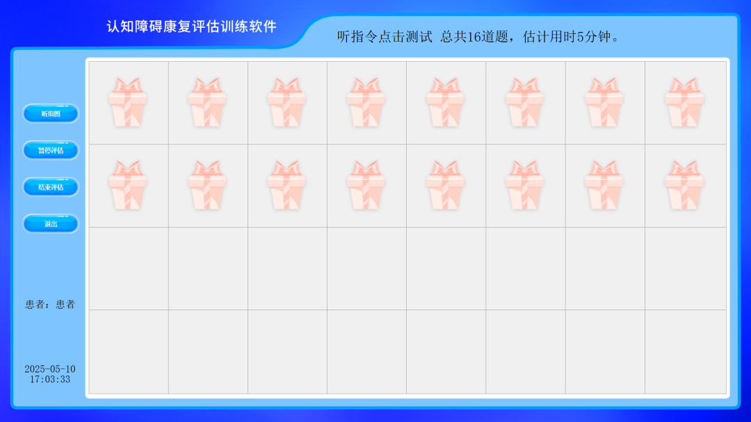 结构化评估体系:系统集成6大认知领域,全程自动化施测与计分,避免人为误差,涵盖“听指令点击”、“听指图”、“事件推理”、“自发语言”等19个标准化量表任务,全面评估定向力、注意力、语言表达与理解、视空间、记忆、计算、执行及日常推理等核心能力。