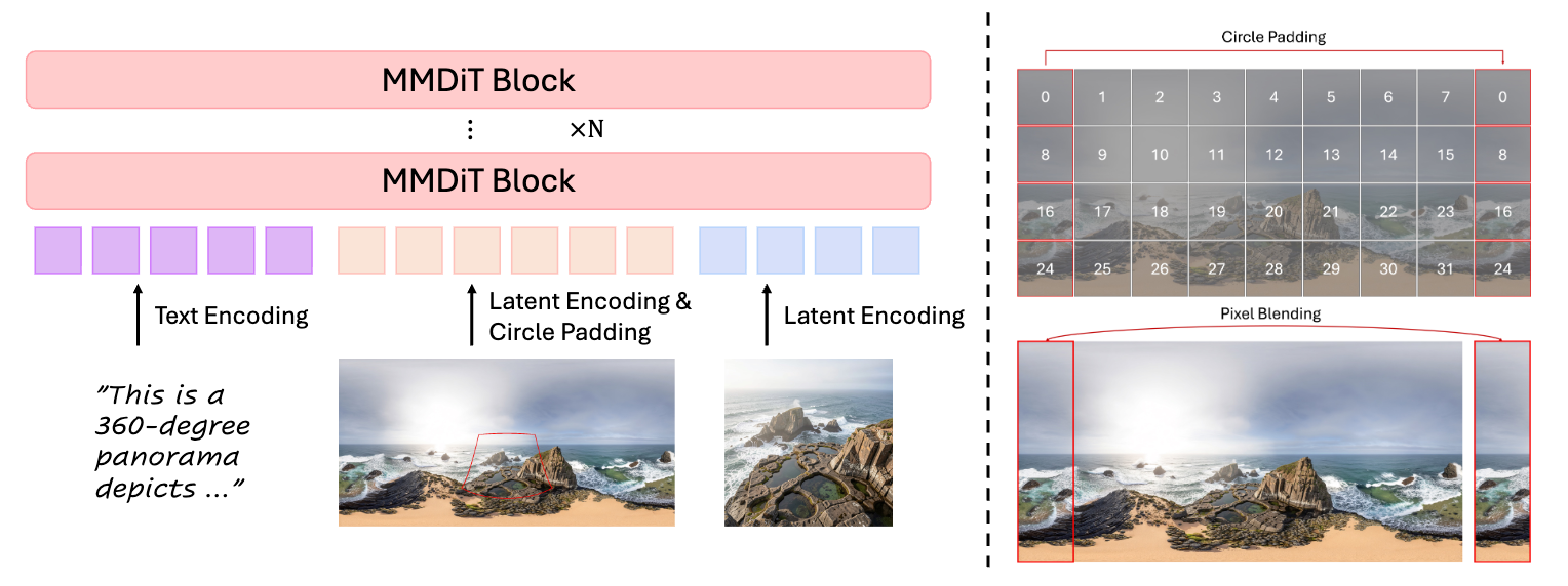 HY-World 2.0 全新升级HY-Pano-2.0模型, 采用端到端隐式学习方案,让模型自己学会从普通图片到 360 度全景的空间映射,完全不需要任何相机元数。再配合团队的真实全景照片和 UE 引擎合成数据的混合训练策略,保证了生成质量和泛化能力。